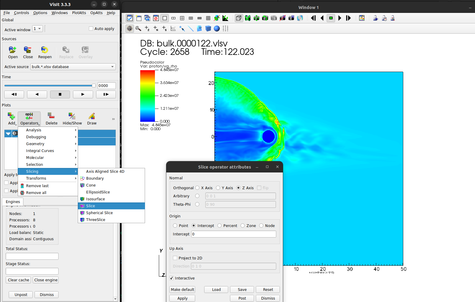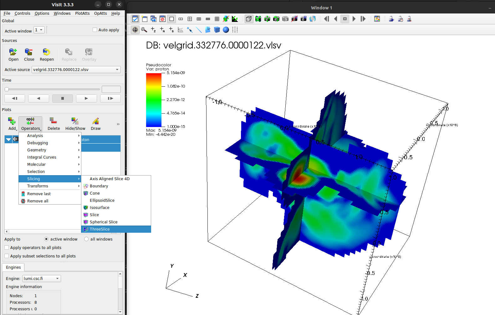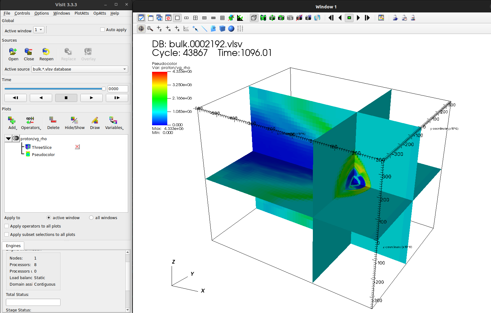 Let’s start by getting a quick overview with a pseudocolor plot of proton/vg_rho once more, and add a threeslice operator.