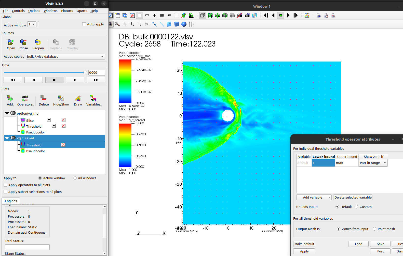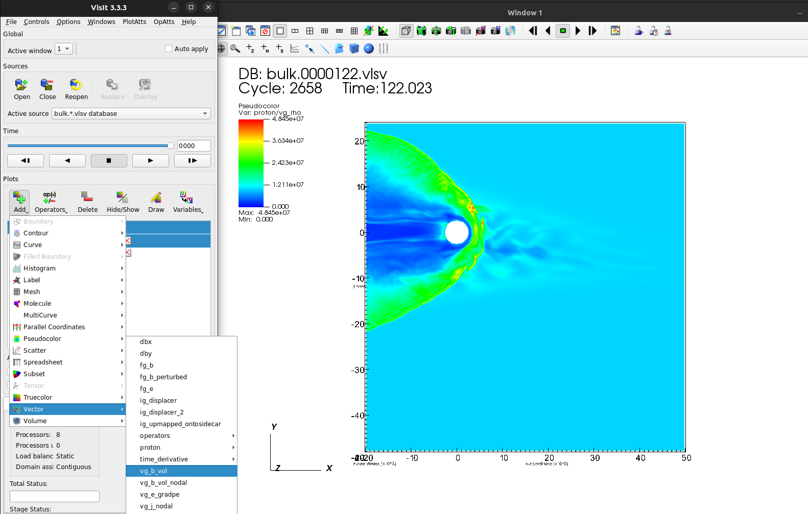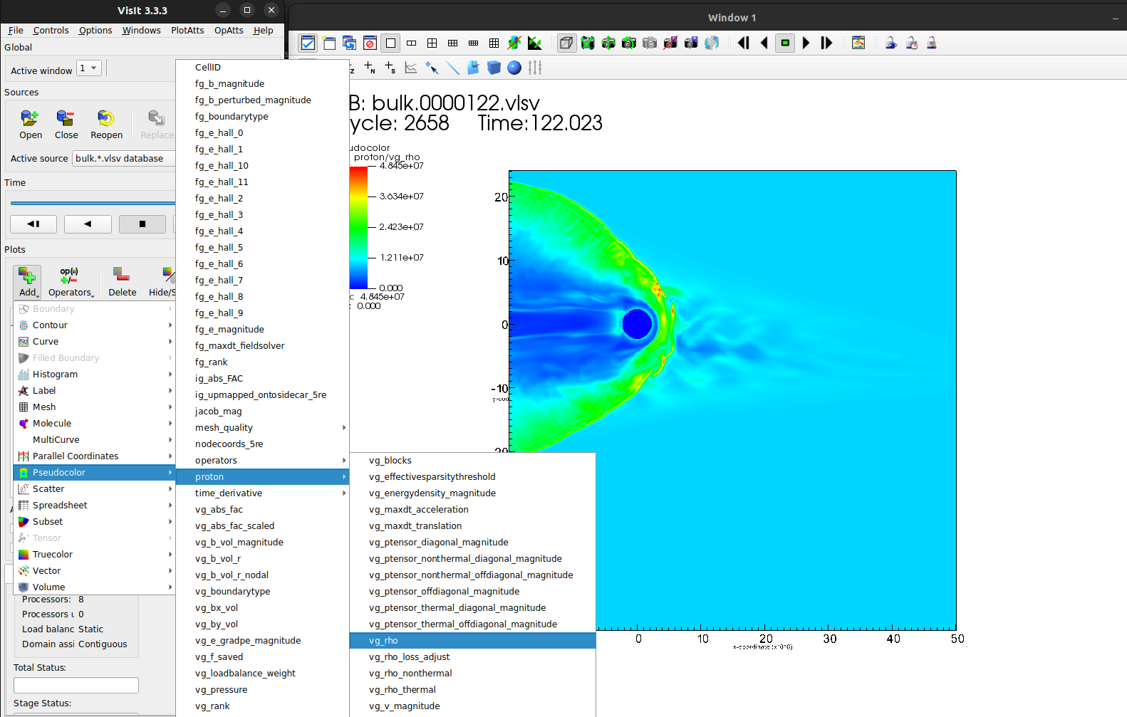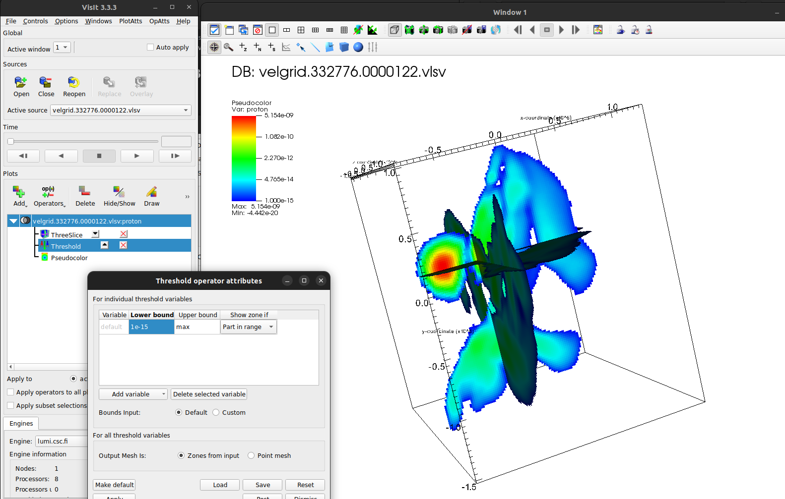 Let’s start by getting a quick overview with a pseudocolor plot of proton/vg_rho once more, and add a threeslice operator.