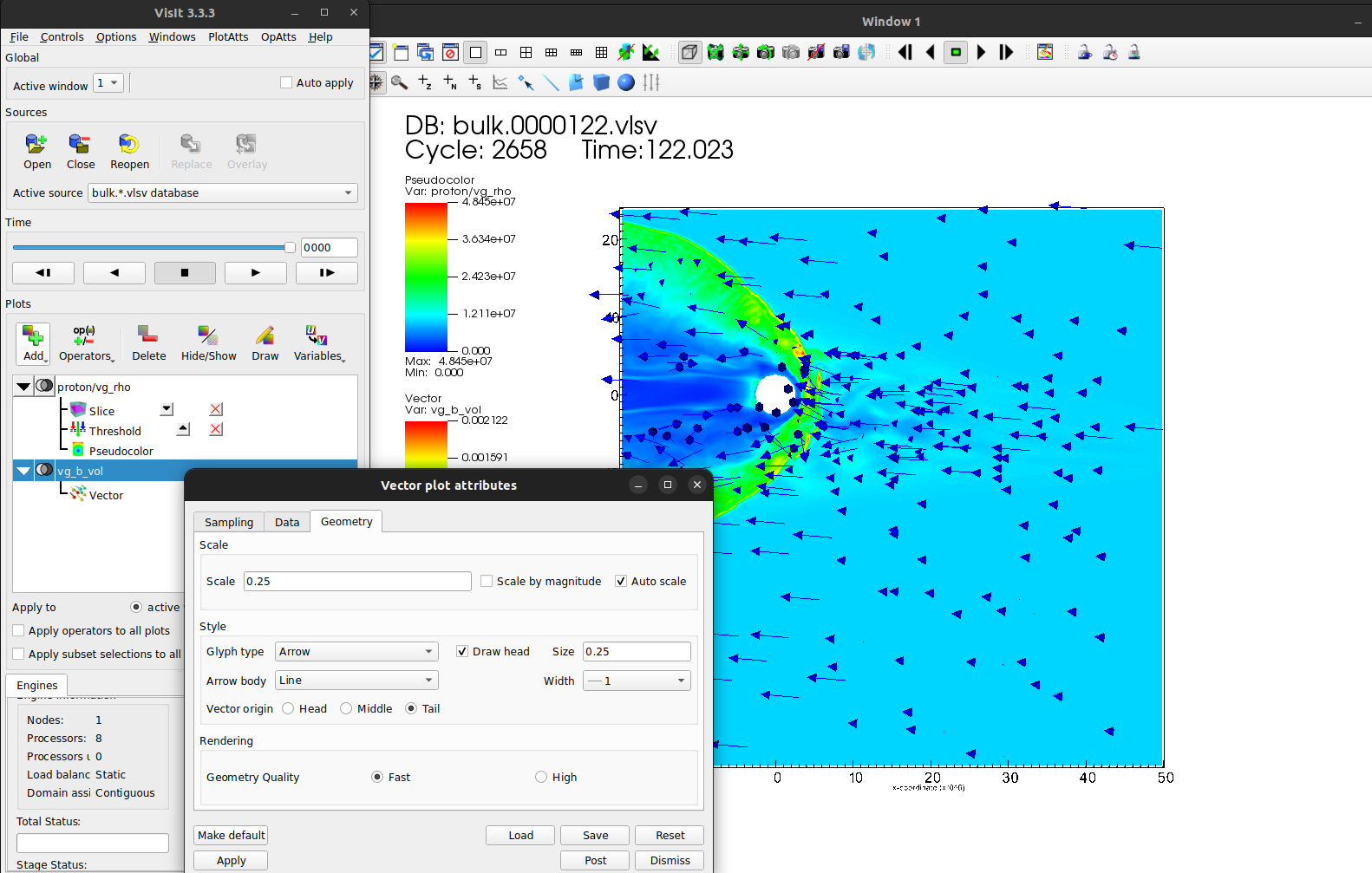 Let’s go to Vector plot attributes, Geometry tab, and unselect Scale by magnitude, Apply:
