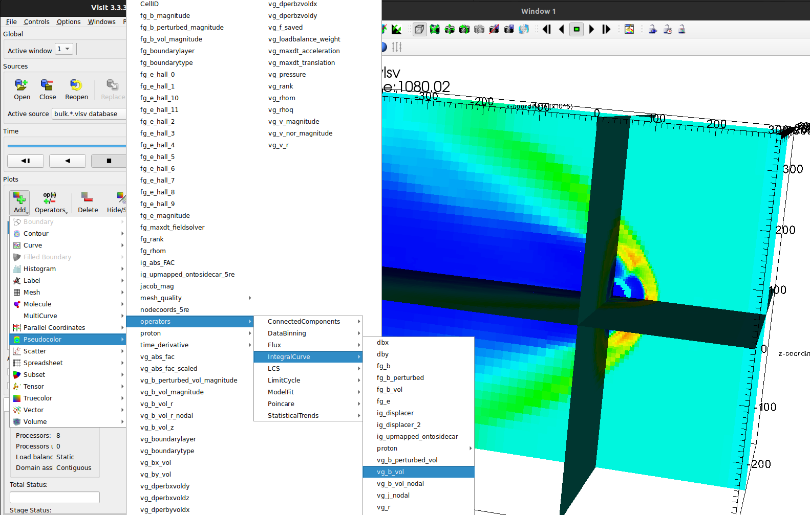 Let’s add some fieldlines! These are produced in VisIt through an IntegralCurve system, which can be a bit hard to get into. Add a new pseudocolor plot with the variable: operators->IntegralCurve->vg_b_vol: