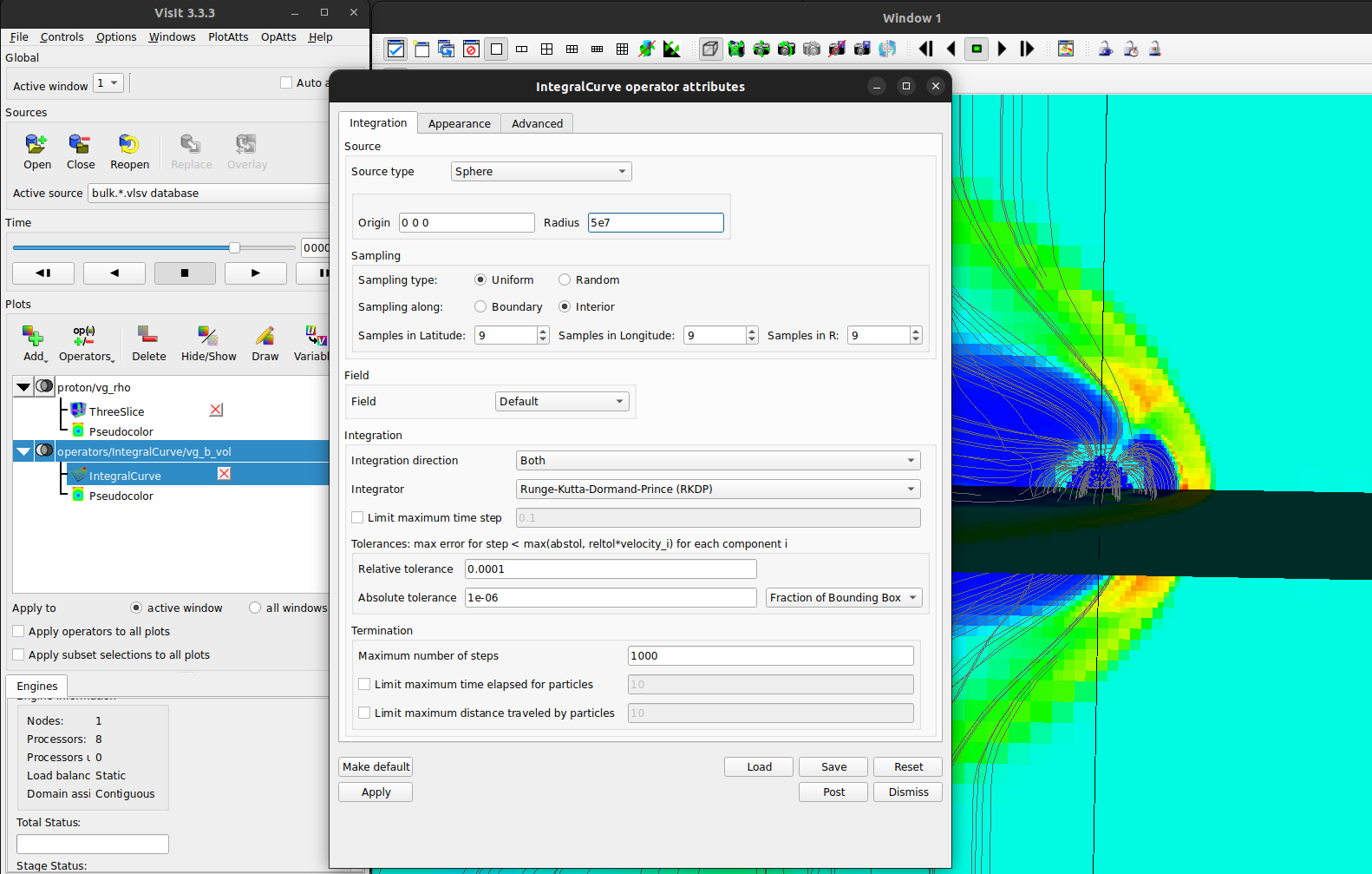 Double-clicking on the integralcurve operator let’s you adjust the seeding of the lines. Let’s do something like the following - a spherical region with some radius of ~5e7 meters: