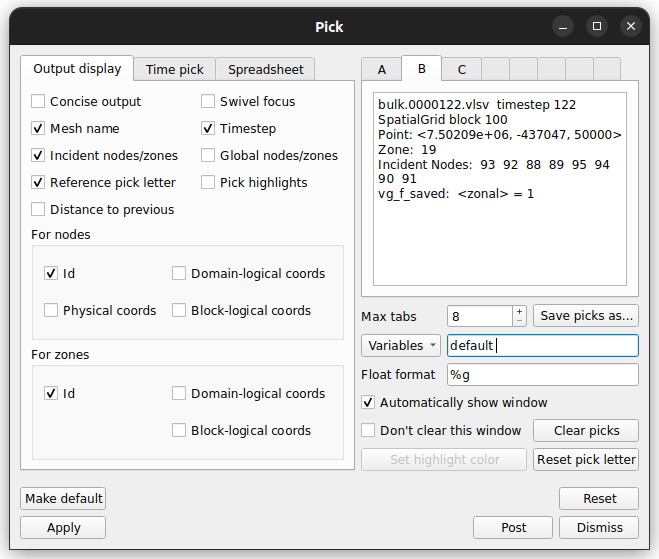 Pick operators in the VisIt viewer. Z for zonal, N for nodal. S for spreadsheet.